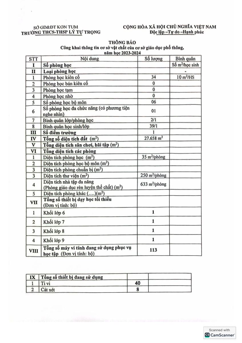 Công khai thông tin cơ sở vật chất của cơ sở giáo dục phổ thông, năm học 2023-2024