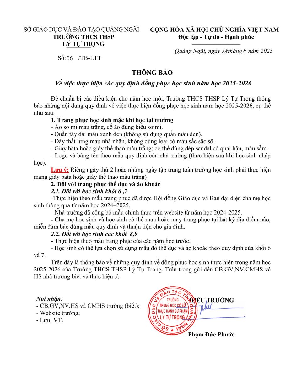THÔNG BÁO Về việc thực hiện các quy định đồng phục học sinh năm học 2025-2026