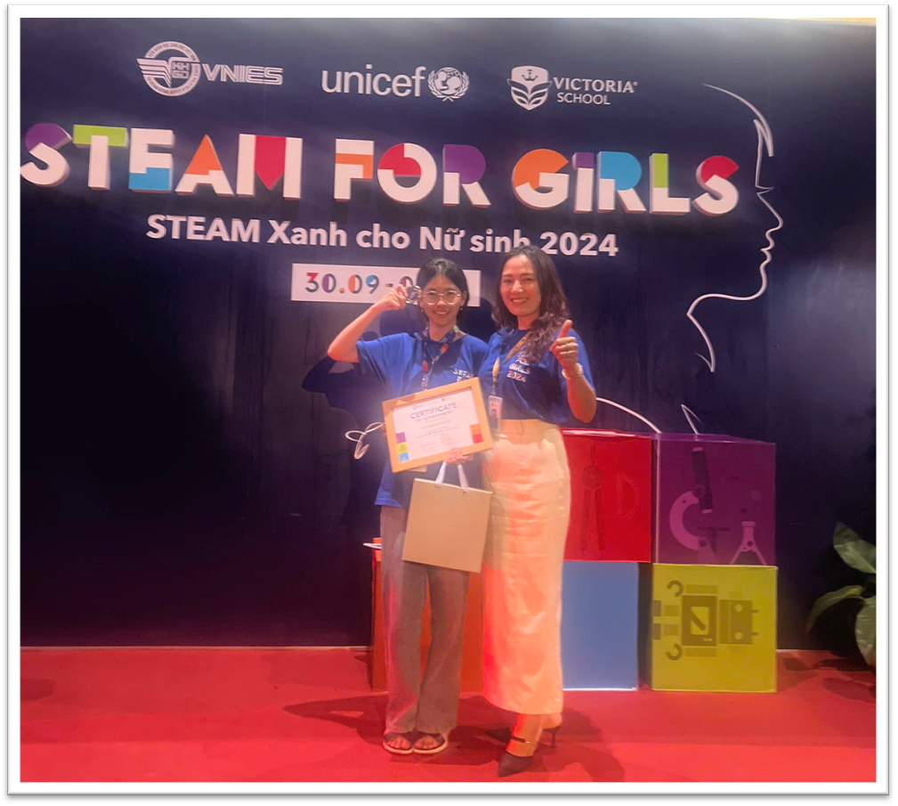 Với những nỗ lực và thành tích xuất sắc, Bùi Thảo Uyên Nhi và nhóm đã xuất sắc giành được huy chương bạc trong cuộc thi STEAM For Girls - STEAM Xanh cho nữ sinh 2024, khẳng định vị thế của học sinh nữ trong lĩnh vực khoa học và công nghệ.