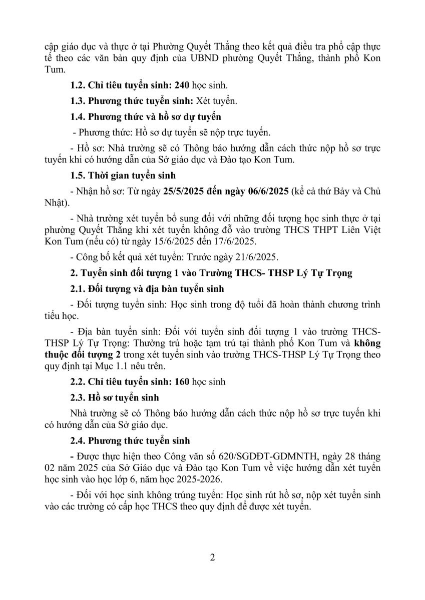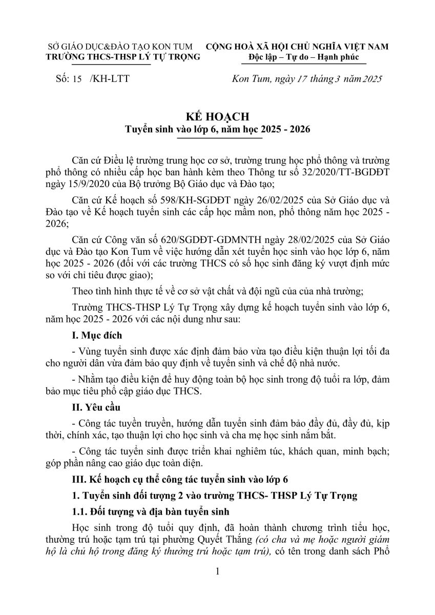 Kế hoạch tuyển sinh vào lớp 6, năm học 2025 - 2026