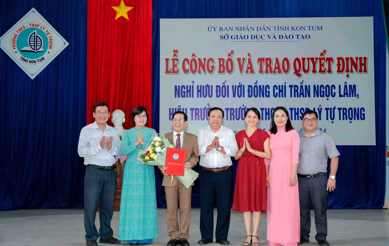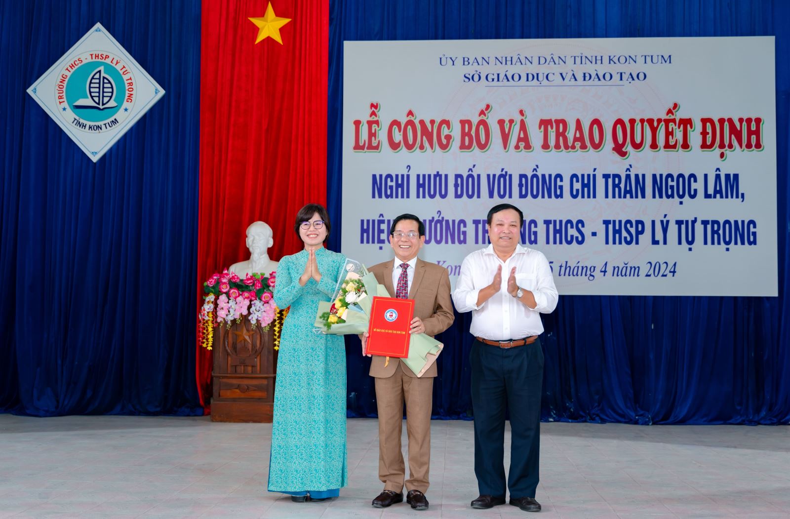 Đồng chí Phạm Thị Trung, Giám đốc Sở GDĐT Kon Tum trao Quyết định nghỉ hưu cho đồng chí Trần Ngọc Lâm