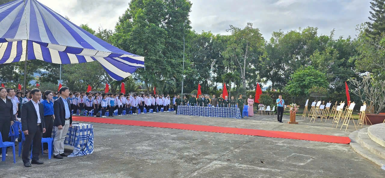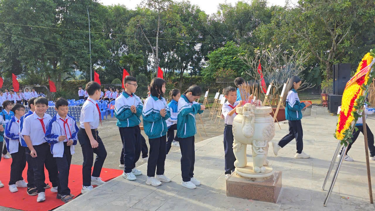 Mở đầu chương trình là lễ dâng hương và dâng hoa tại đài tưởng niệm các anh hùng liệt sĩ, nơi các em học sinh bày tỏ lòng tri ân sâu sắc đến những người đã hy sinh vì độc lập dân tộc. Tiếp nối là phần văn nghệ chào mừng với chủ đề “Hành quân theo bước chân những người anh hùng”, do chính các em đội viên biểu diễn, tạo nên bầu không khí hào hùng nhưng cũng đầy xúc động.