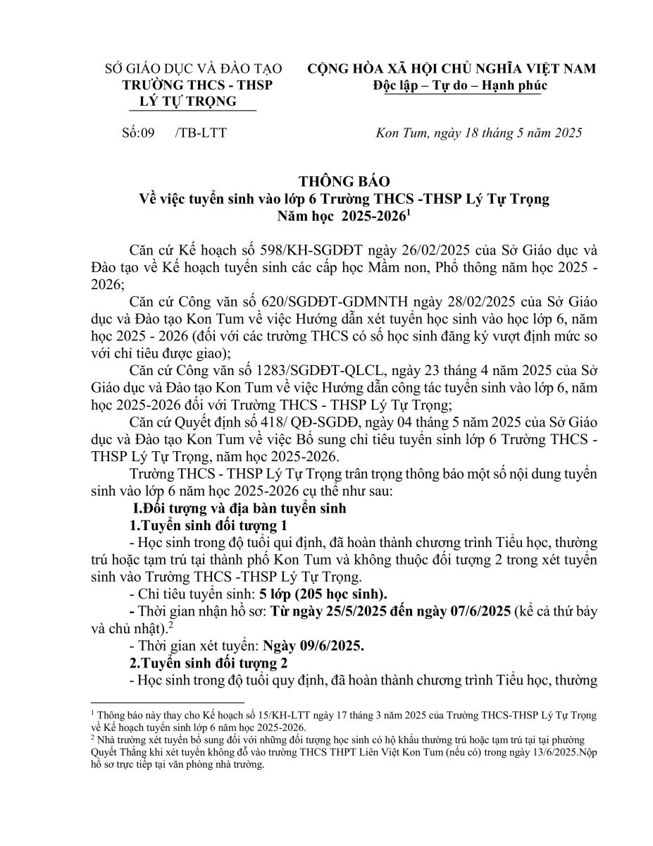 Thông báo về việc tuyển sinh vào lớp 6 Trường THCS -THSP Lý Tự Trọng Năm học 2025-2026