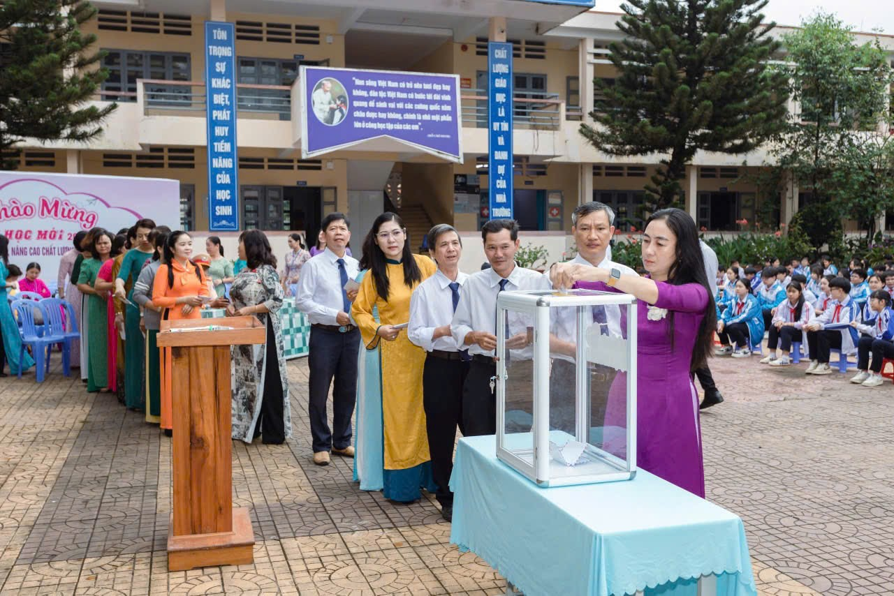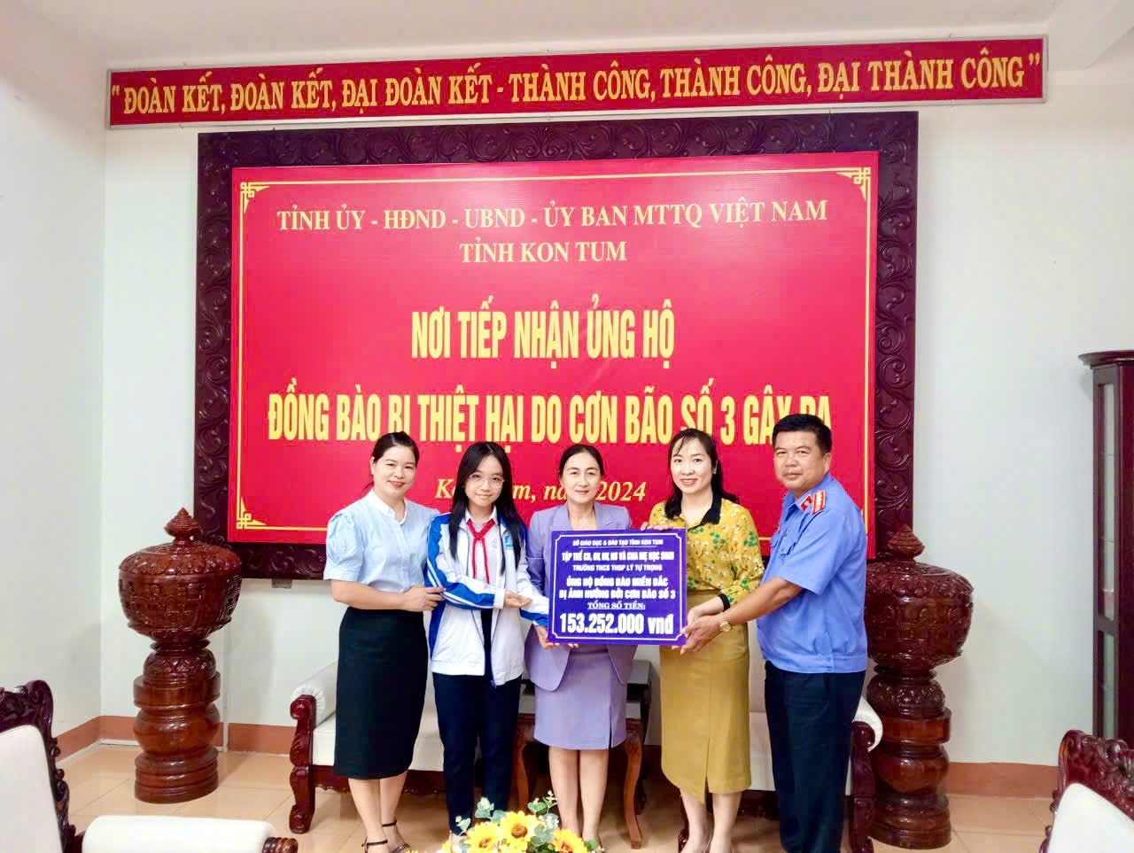 Vào sáng ngày 20/9/2024, đại diện nhà trường, gồm cô Nguyễn Lê Thanh Hương – cán bộ giáo viên, ông Lê Văn Thắng – Trưởng ban đại diện Cha mẹ học sinh, và em Trần Ngọc Song Thư – Chi đội trưởng lớp 9D1, đã trực tiếp trao số tiền 153.252.000 đồng cho Mặt trận Tổ quốc Việt Nam tỉnh Kon Tum. Đây là sự sẻ chia quý báu nhằm giúp đỡ đồng bào miền Bắc khắc phục hậu quả của thiên tai, sớm ổn định cuộc sống.