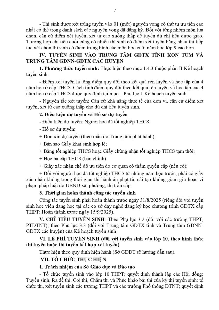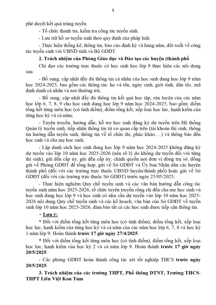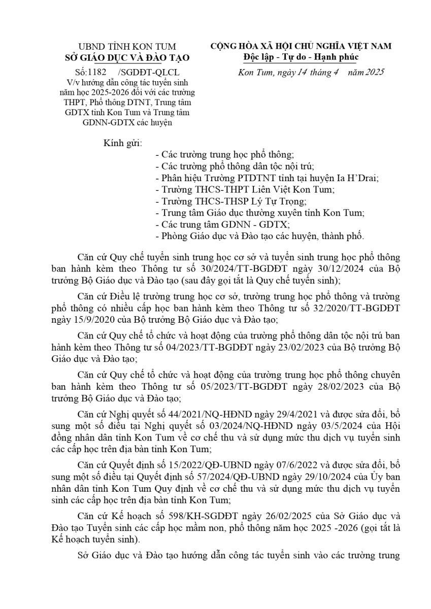 Về việc hướng dẫn công tác tuyển sinh năm học 2025-2026 đối với các trường THPT, Phổ thông DTNT, Trung tâm GDTX tỉnh Kon Tum và Trung tâm GDNN-GDTX các huyện