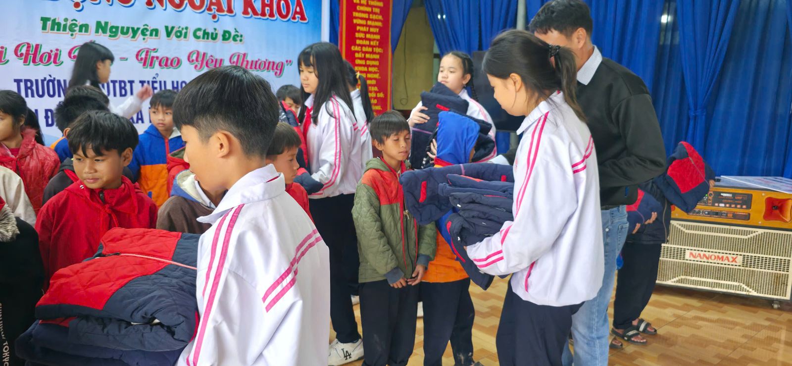 Điểm đến thứ hai là Trường PTDTBT Tiểu học Kon Plông, nằm tại thôn Đắk Lôm, xã Kon Plông. Tại đây, các em học sinh từ khối 1 đến khối 5 đã đón nhận 381 chiếc áo ấm, phần quà đầy ý nghĩa từ hoạt động thiện nguyện của nhà trường. Dù các em đã nhận được sự quan tâm từ chế độ bán trú, nhưng những bộ quần áo mùa đông vẫn còn thiếu thốn, đặc biệt trong điều kiện thời tiết khắc nghiệt quanh năm. Những ánh mắt ngây thơ, tròn xoe khi nhận quà, nụ cười rạng rỡ và niềm vui tràn đầy trong từng em nhỏ chính là minh chứng rõ nét cho ý nghĩa của hoạt động nhân văn này.